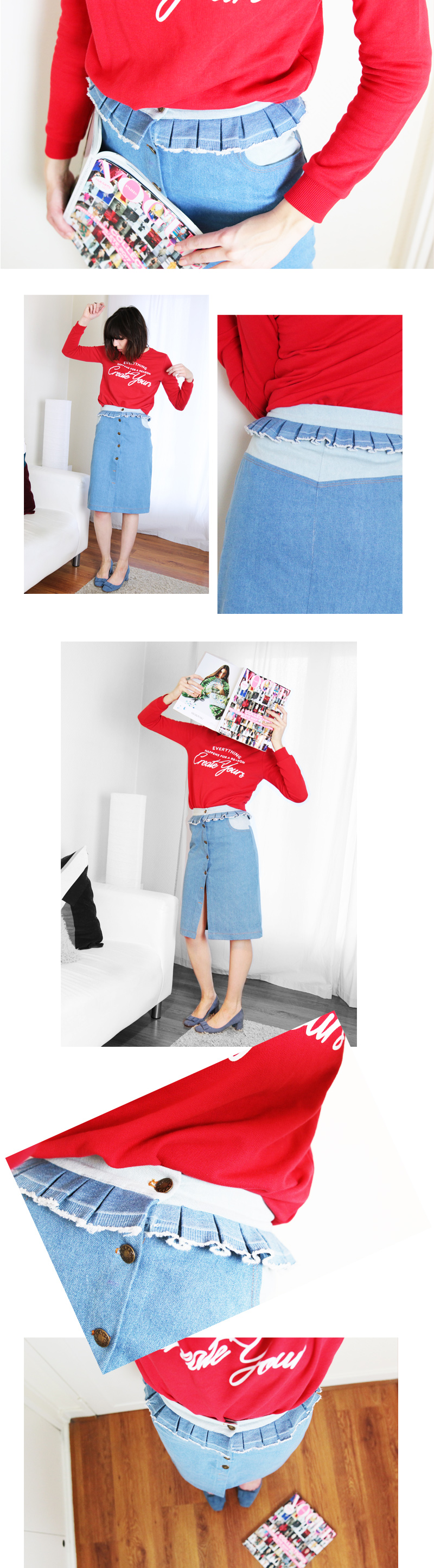 J’ai aussi ajouté un volant au niveau de la ceinture pour ajouter la petite touche d’originalité et de tendance à ma jupe en jeans 🙂