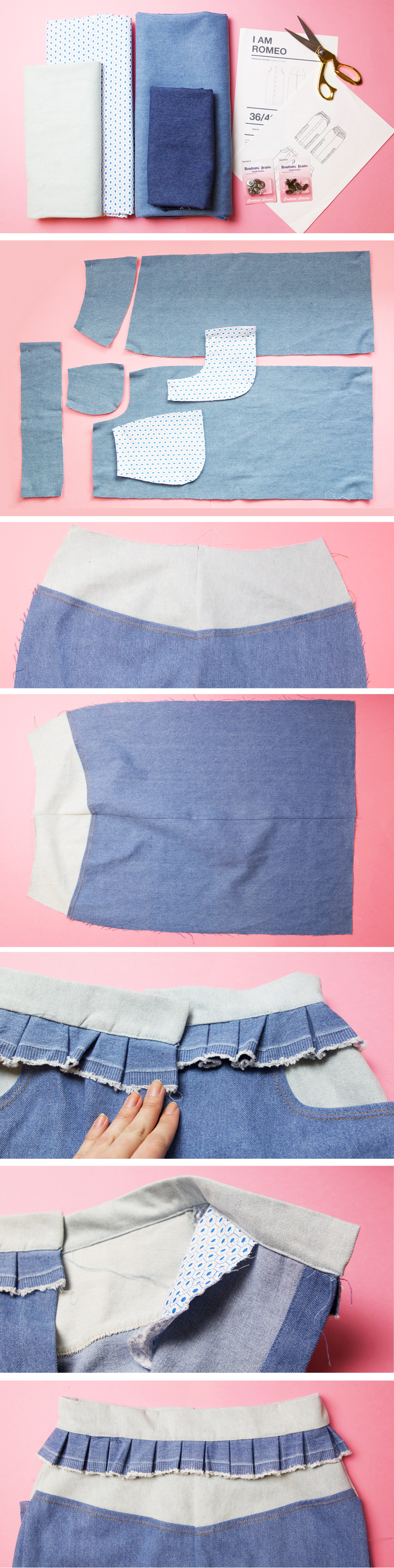 Du coup j’ai décidé de couper la ceinture, les poches et l’arrière de la jupe en jeans claire, et de couper les plus grandes pièces en jeans plus foncé.