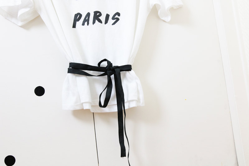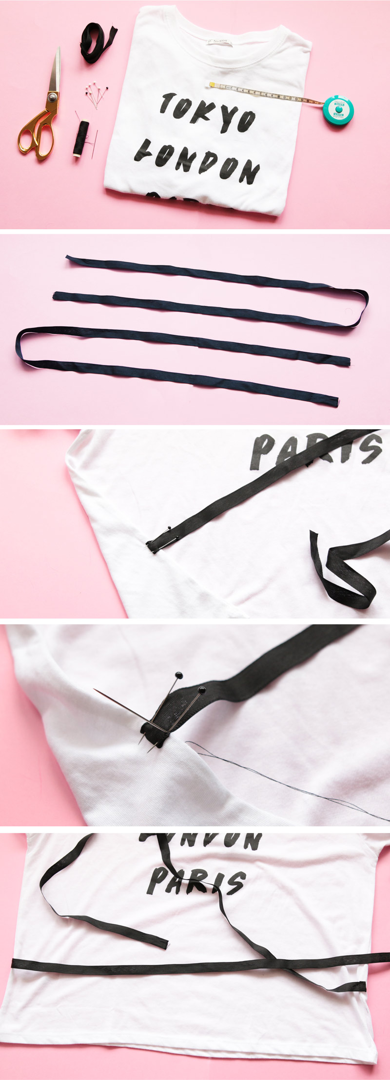 • Fais un petit ourlet au bout de l’un des galons, roule le encore une fois, et épingle le tout sur la couture de l’un des cotés du t-shirt