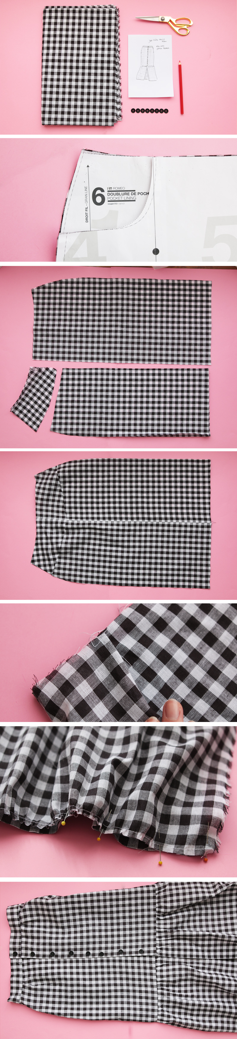 • Tout d’abords j’ai utilisé le patron pour le haut de la jupe, la ceinture reste la même et le derrière aussi. Pour le devant j’ai simplement fait l’impase sur les poches en découpant la forme entière avec la pièce de poche ( par contre il faut penser à faire une petite fronce de 1 cm de chaque coté du devant de la jupe avant de coudre la ceinture.