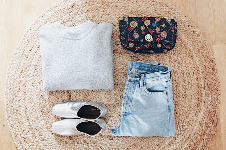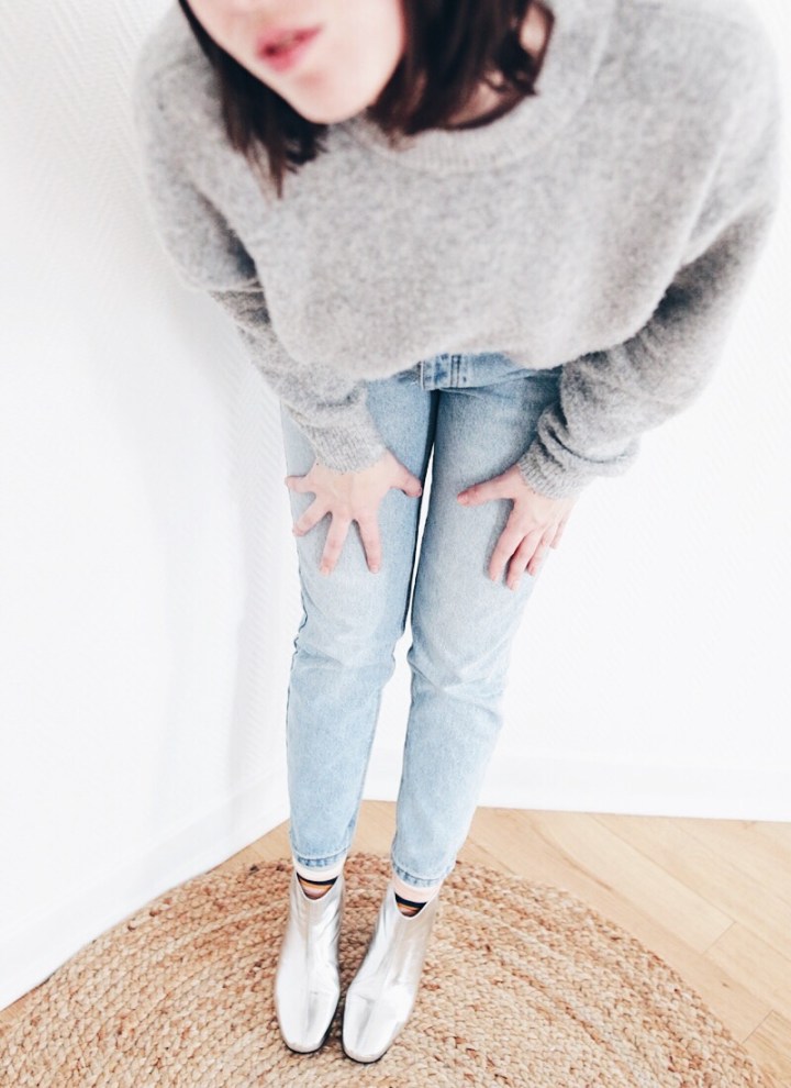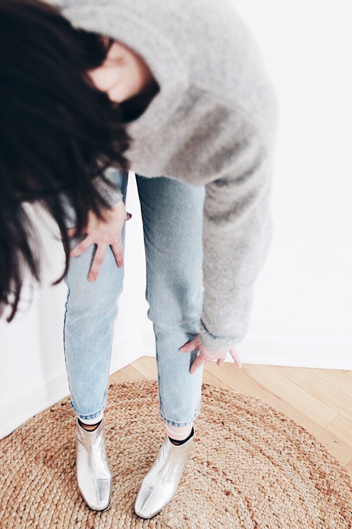 En fait je suis une vrai fan des chaussures argentés ! Contrairement à ce que l’on pourrait penser l’argenté se mixe très bien à beaucoup de tenues et apporte une touche moderne et design a la tenue . bref je suis fan et voici une tenue très simple , un rappel de gris sur le pull et un jeans et le tour est joué !