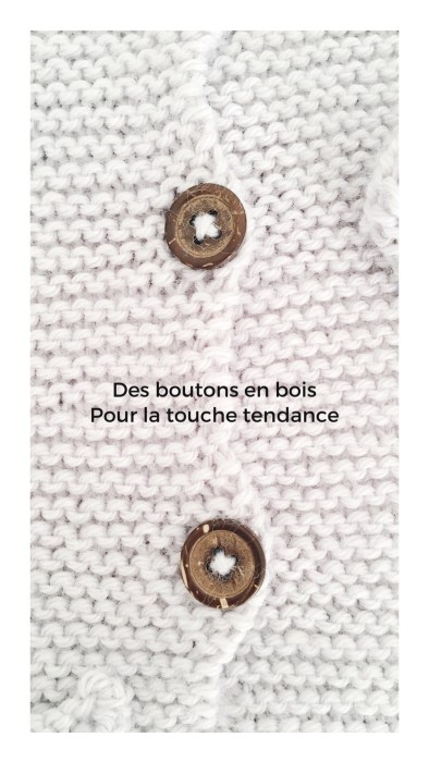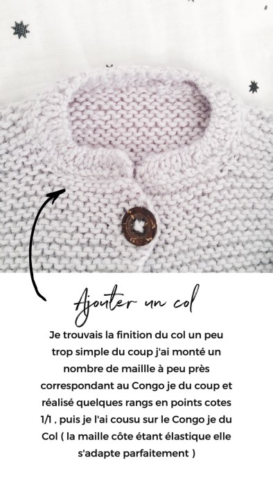 Pour ma version : j’ai ajouté un col en montant à part des côtes 1/1 sur 5 rangs que j’ai cousu ensuite au col . J’ai également ajouté une poche et des boutons en bois pouf la touche tendance !