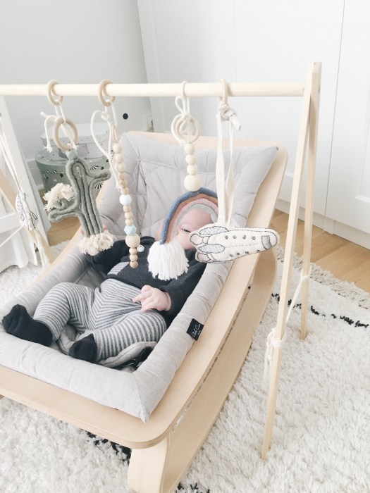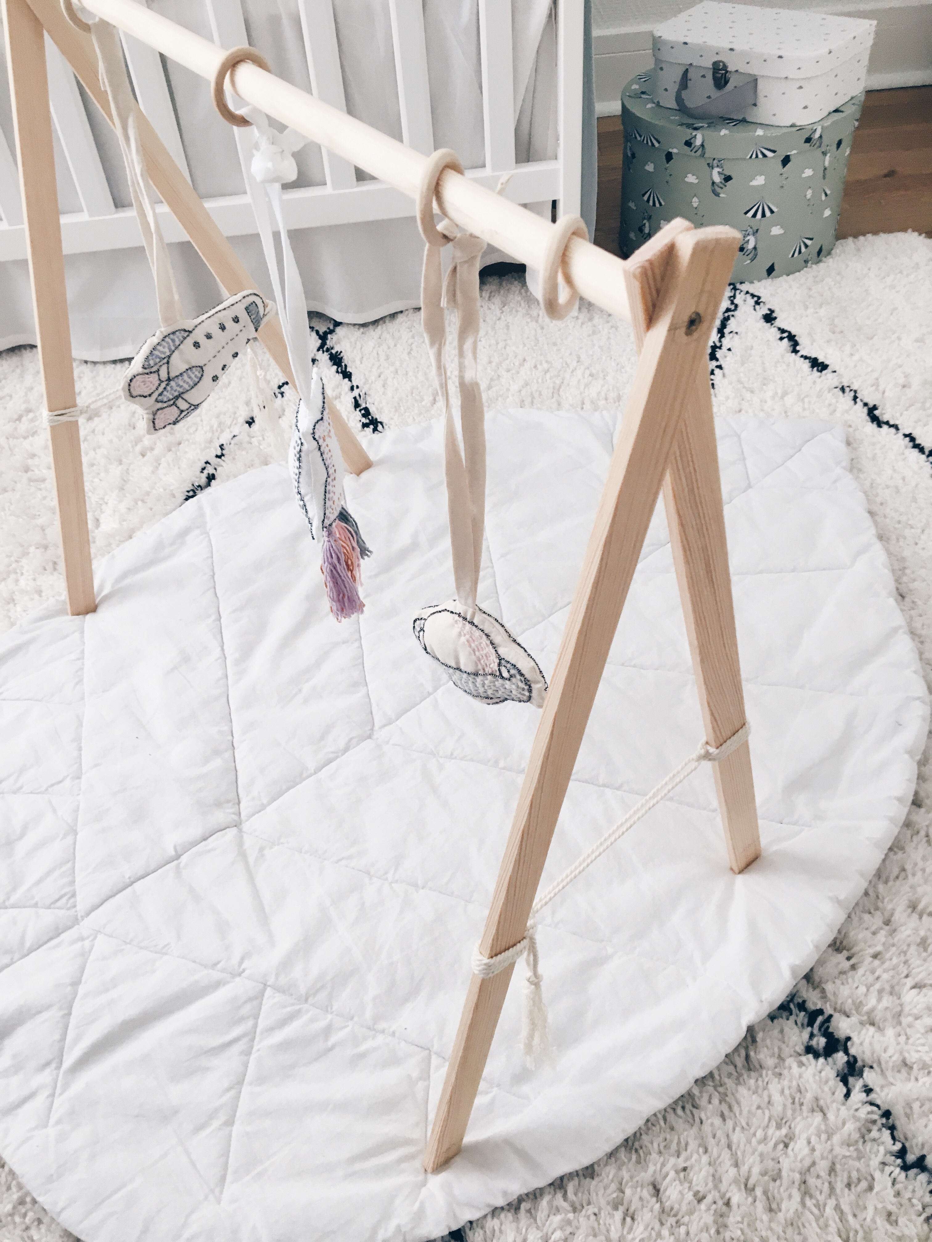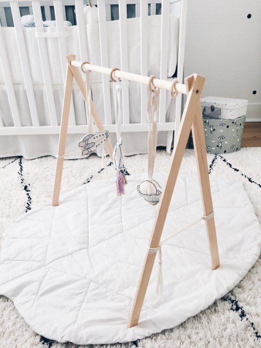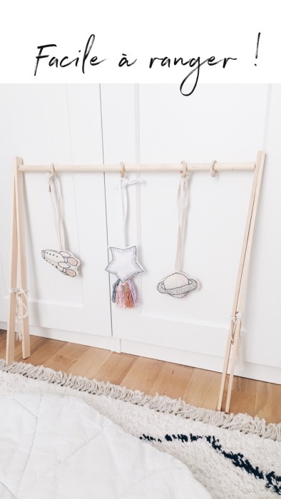 Ce portique permet d’y suspendre de jolies choses pour stimuler l’éveil de bébé, découvrez aussi comment réaliser ces suspensions dans mon DIY suspension d’éveil ici
