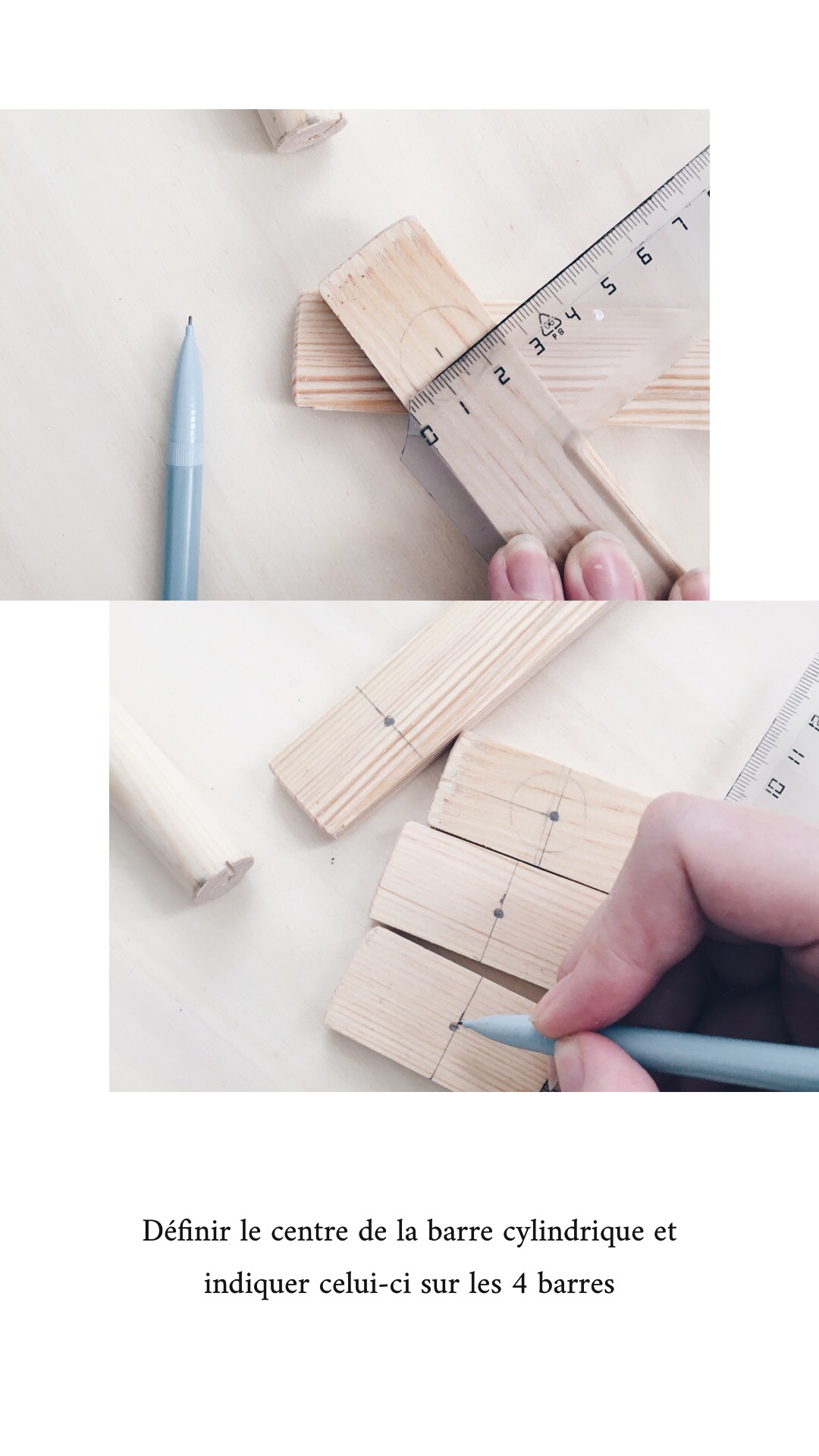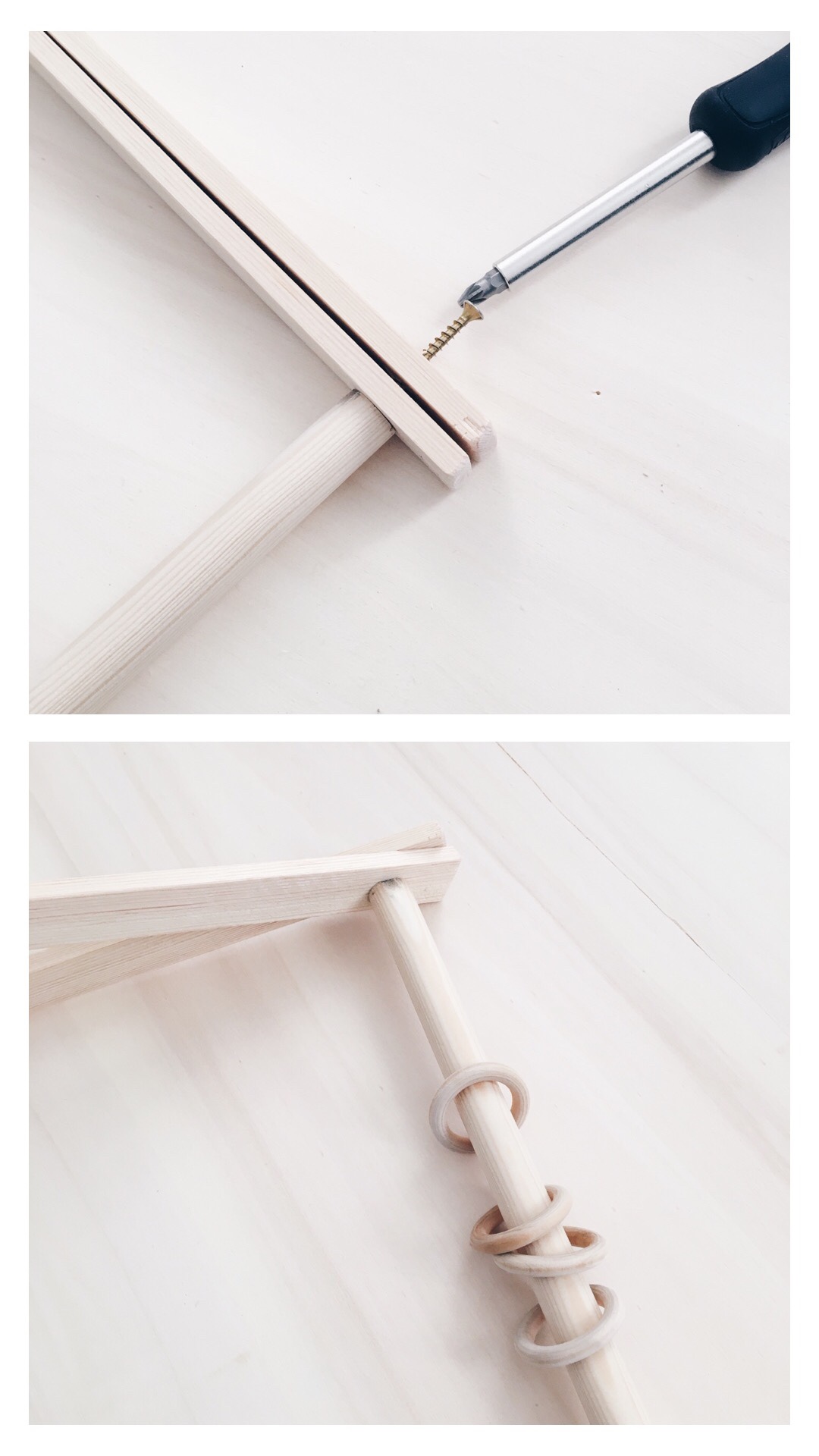 - Tu as 1 premier coté, n’oublies pas de passer les anneaux en bois dans la barre ronde avant d’assembler les 2 autres pieds