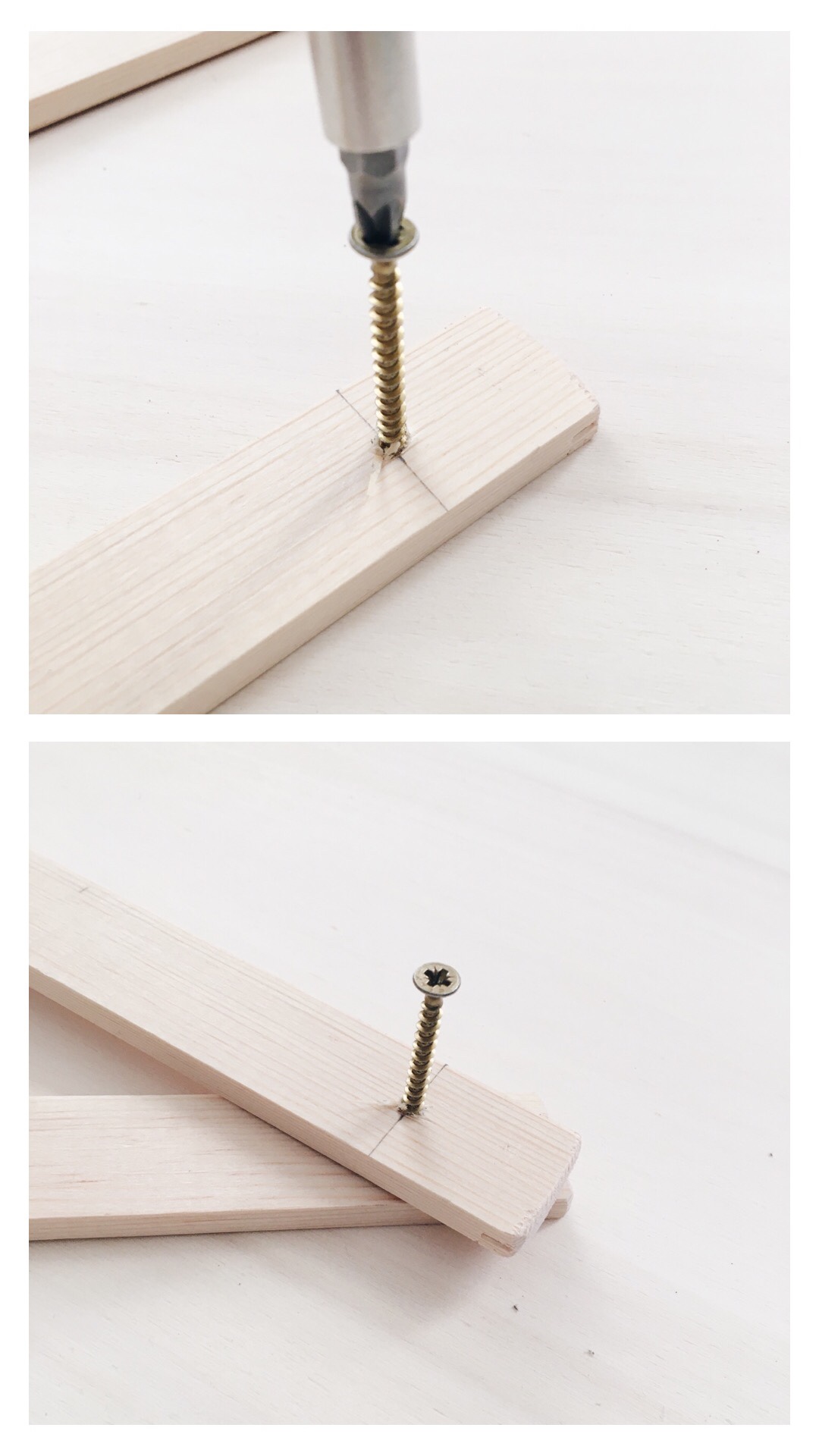 - Prend la vis et visse dans le premier pied, puis traverse le second et enfin continue dans la barre ronde en maintenant bien le tout collé.