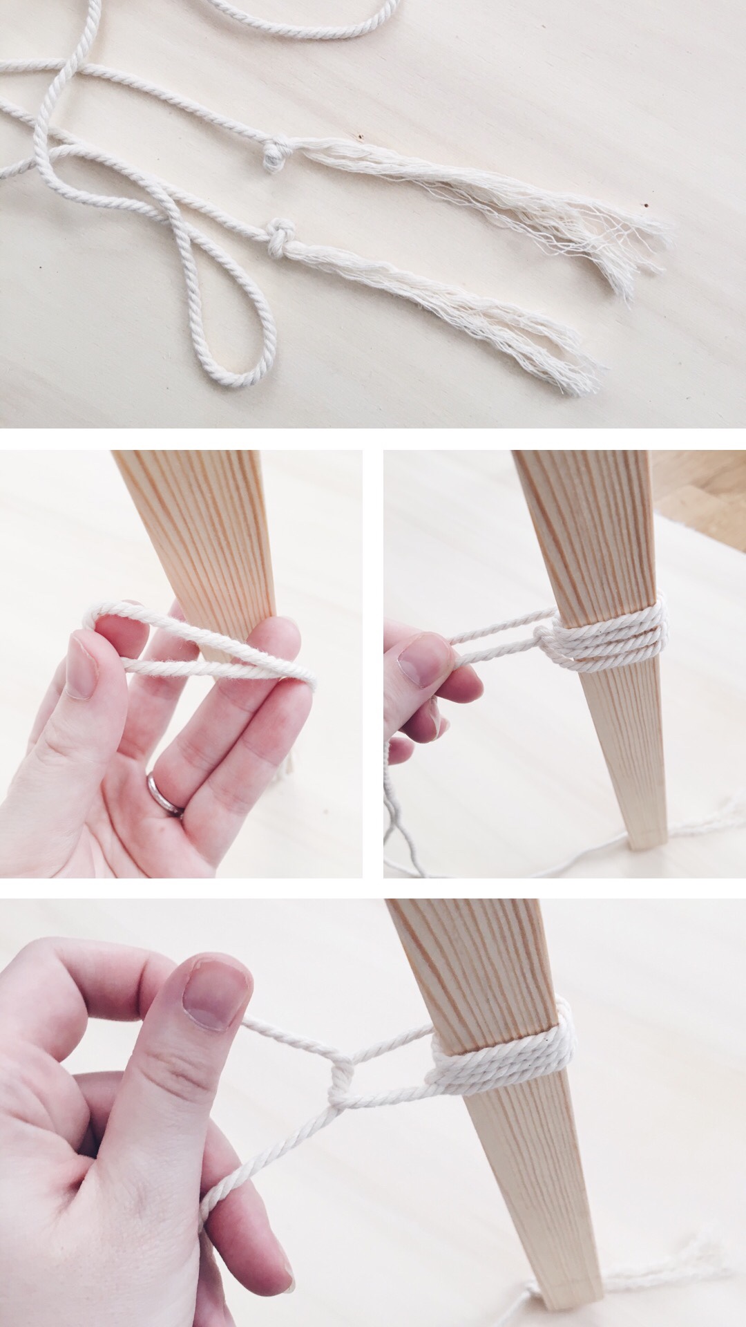 - Découpe une bonne longueur de corde , fait 2 noeuds à 10 cm des extrémités et effiloche pour créer un effet pompon.