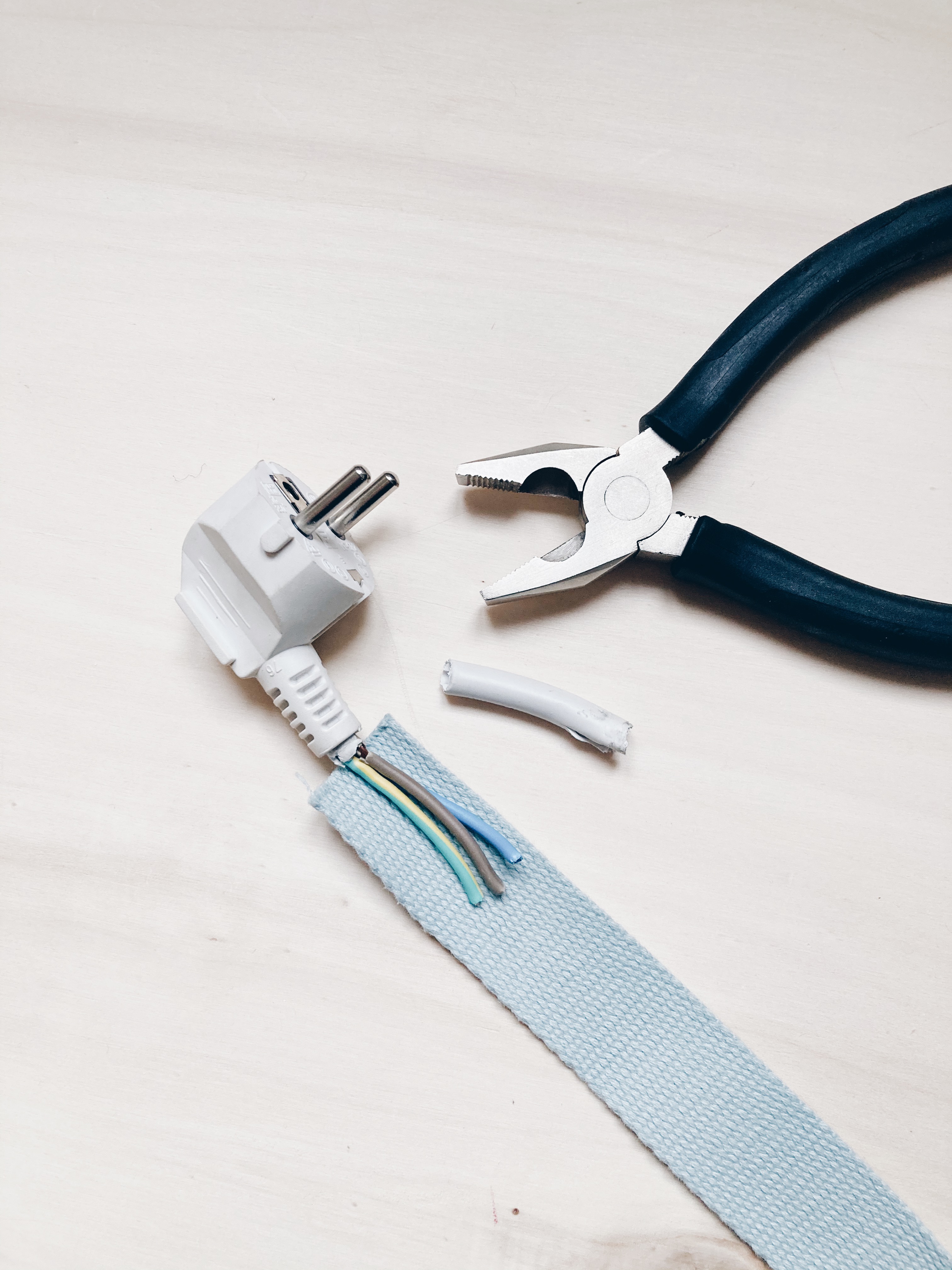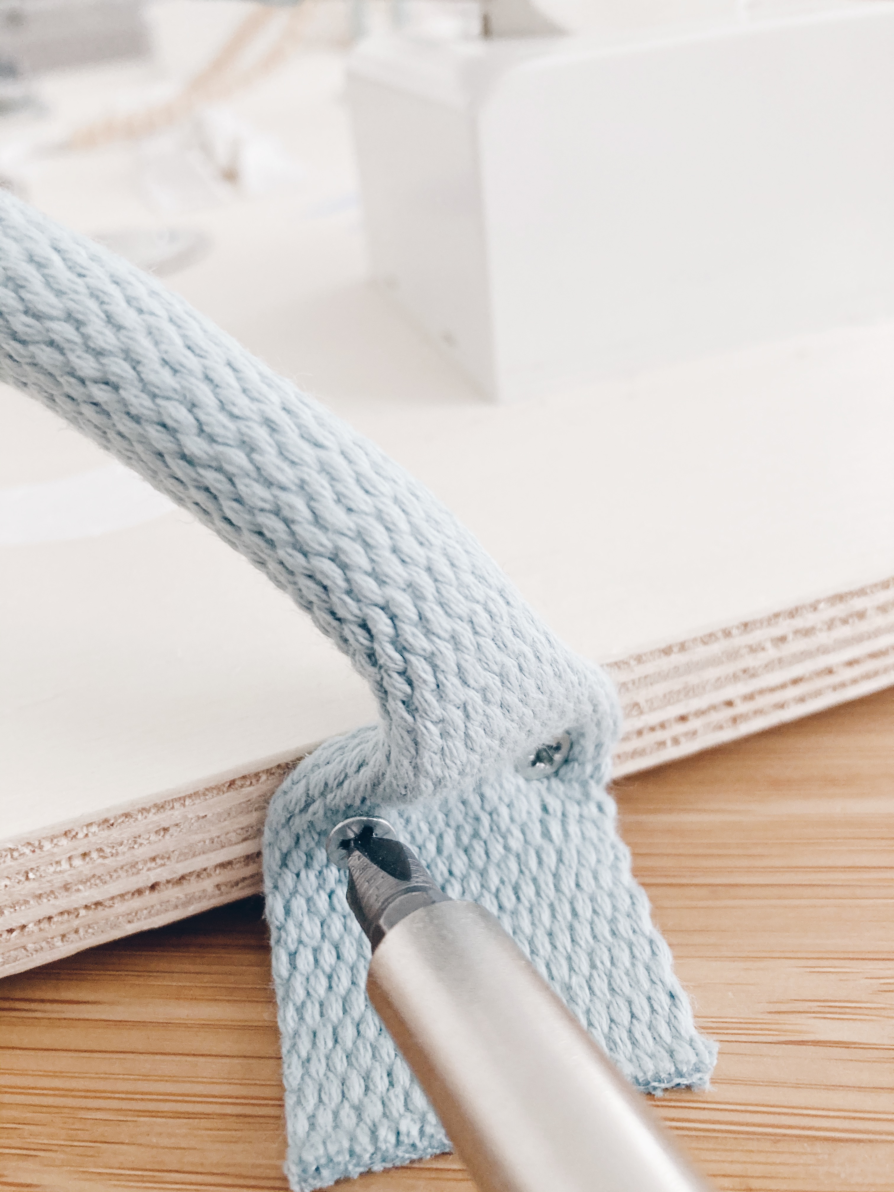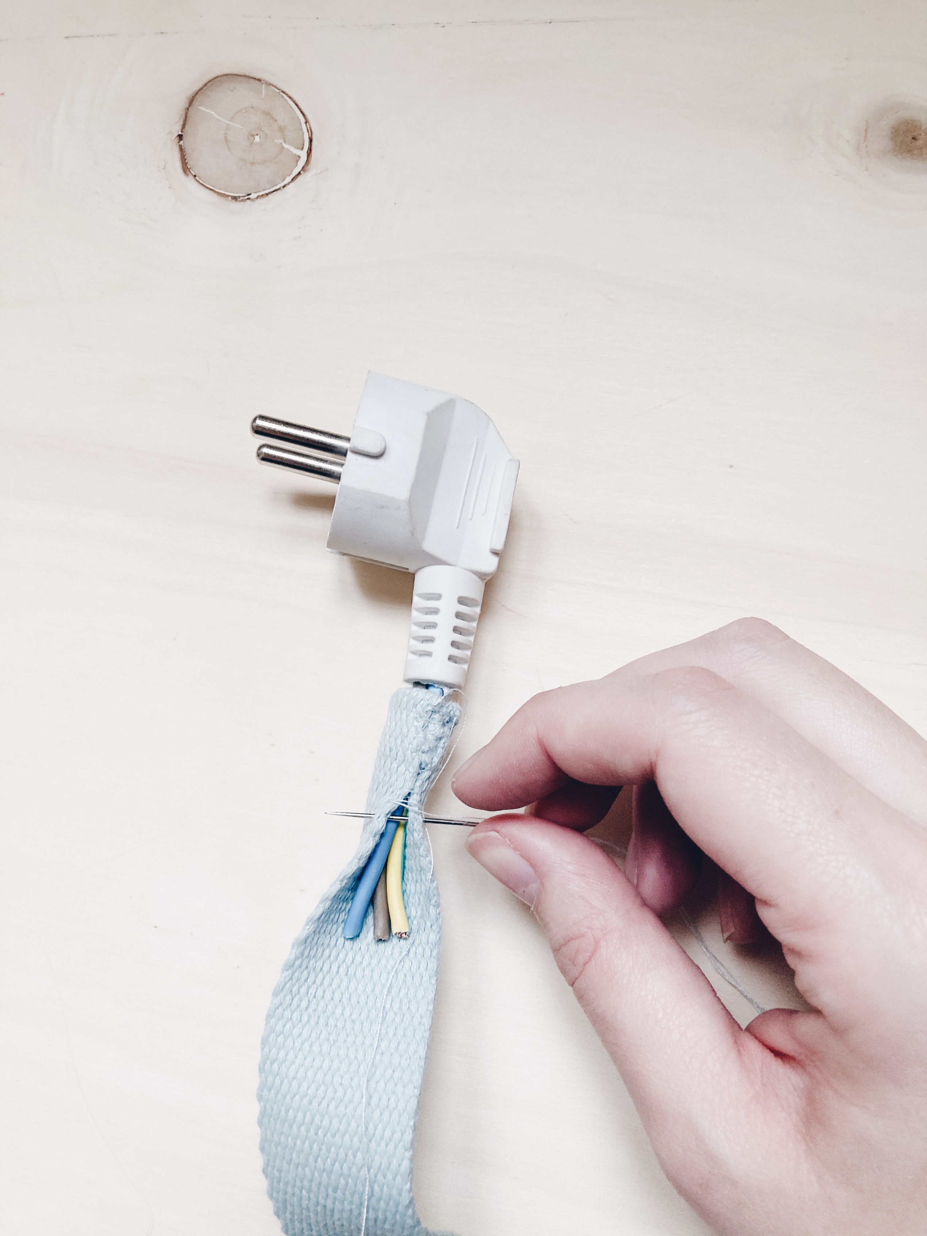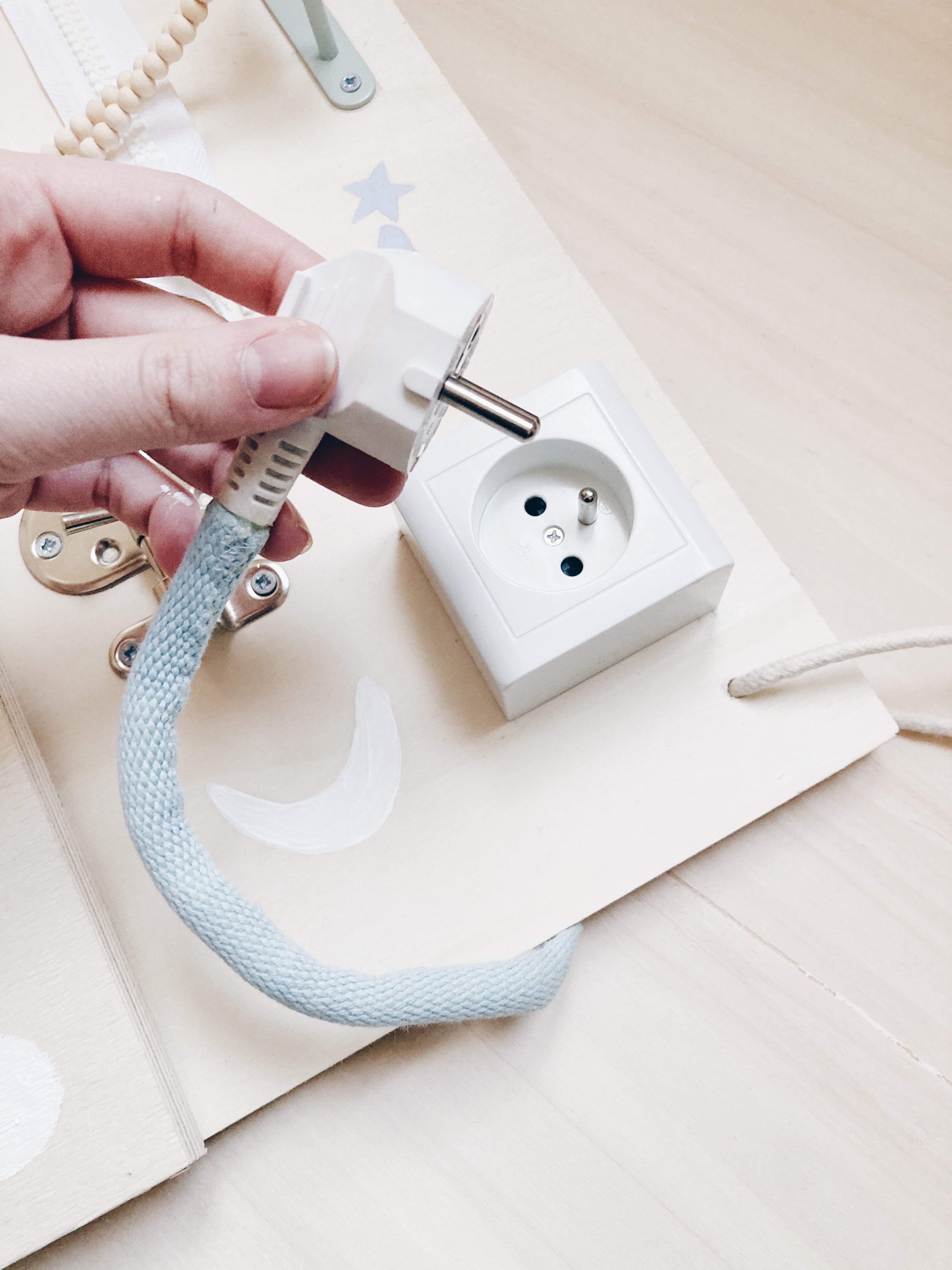 3. J’ai récupéré la tête de prise d’ une vielle rallonge cassé et ai changé le fil avec une sangle pour le rendre plus joli , puis je l’ai vissé au côté de la planche