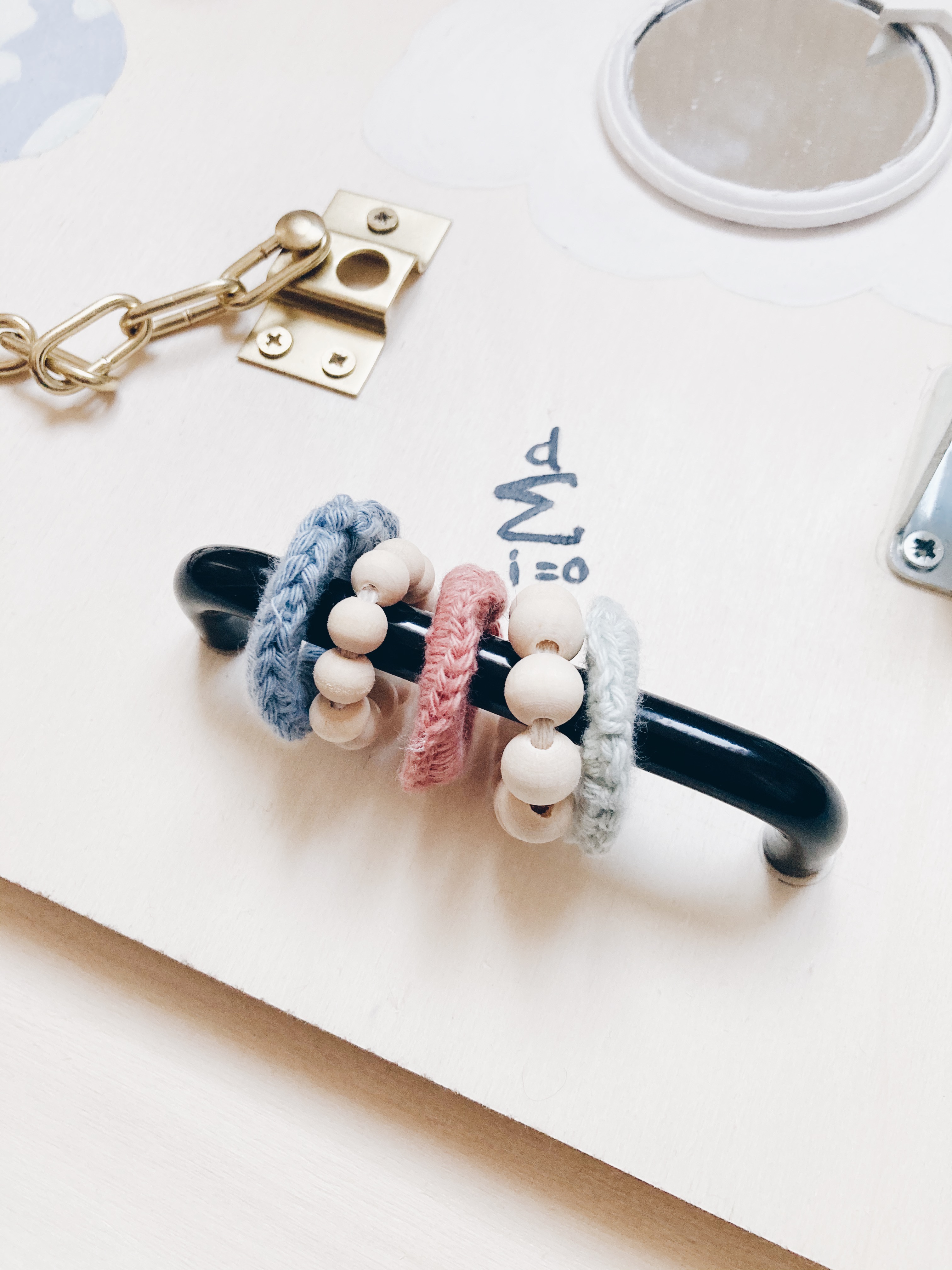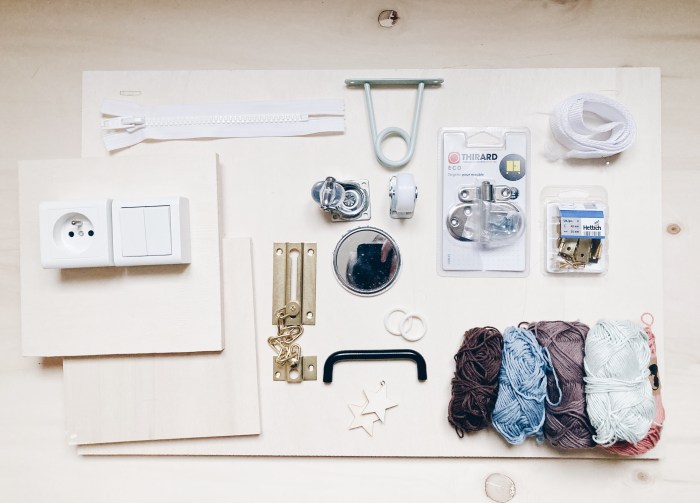 Je me suis donc lancé ! Ce que j’aime dans ce type de tableau c’est l’idée de donner accès aux enfants à des gestes et objets de la vie d’adulte, et quand on voit comme les bébés et très jeunes enfants ont envie de nous immiter je me suis dit que cela pourrait lui plaire !