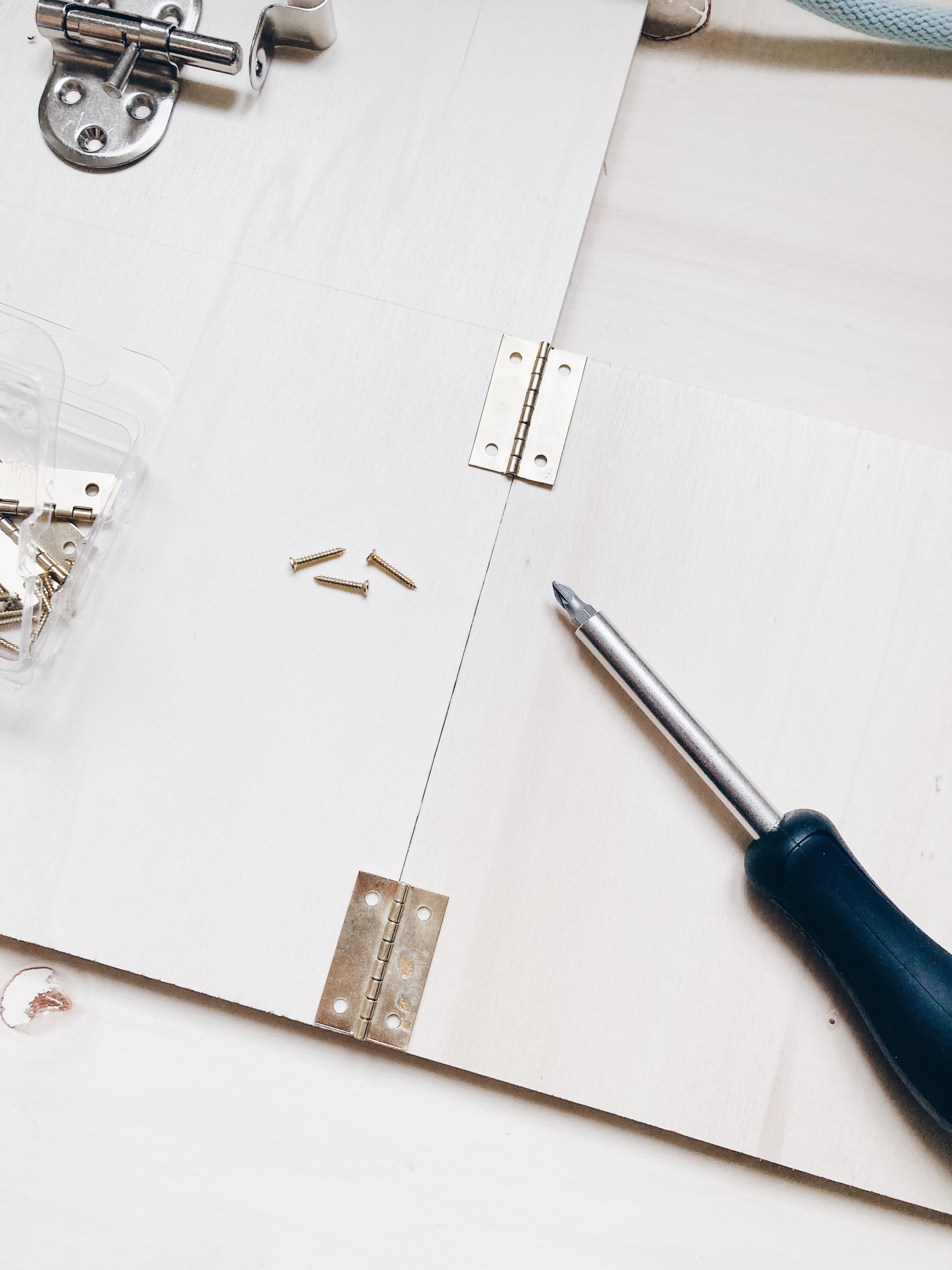 1. Tout d’abords j’ai posé les charnières des 2 portes carrés , pour les relier au panneau principal – il suffit de les poser bien à la jonction entre les deux et de visser avec un tournevis ( a la main c’est possible et plutôt facile mais plus long qu’avec une visseuse )