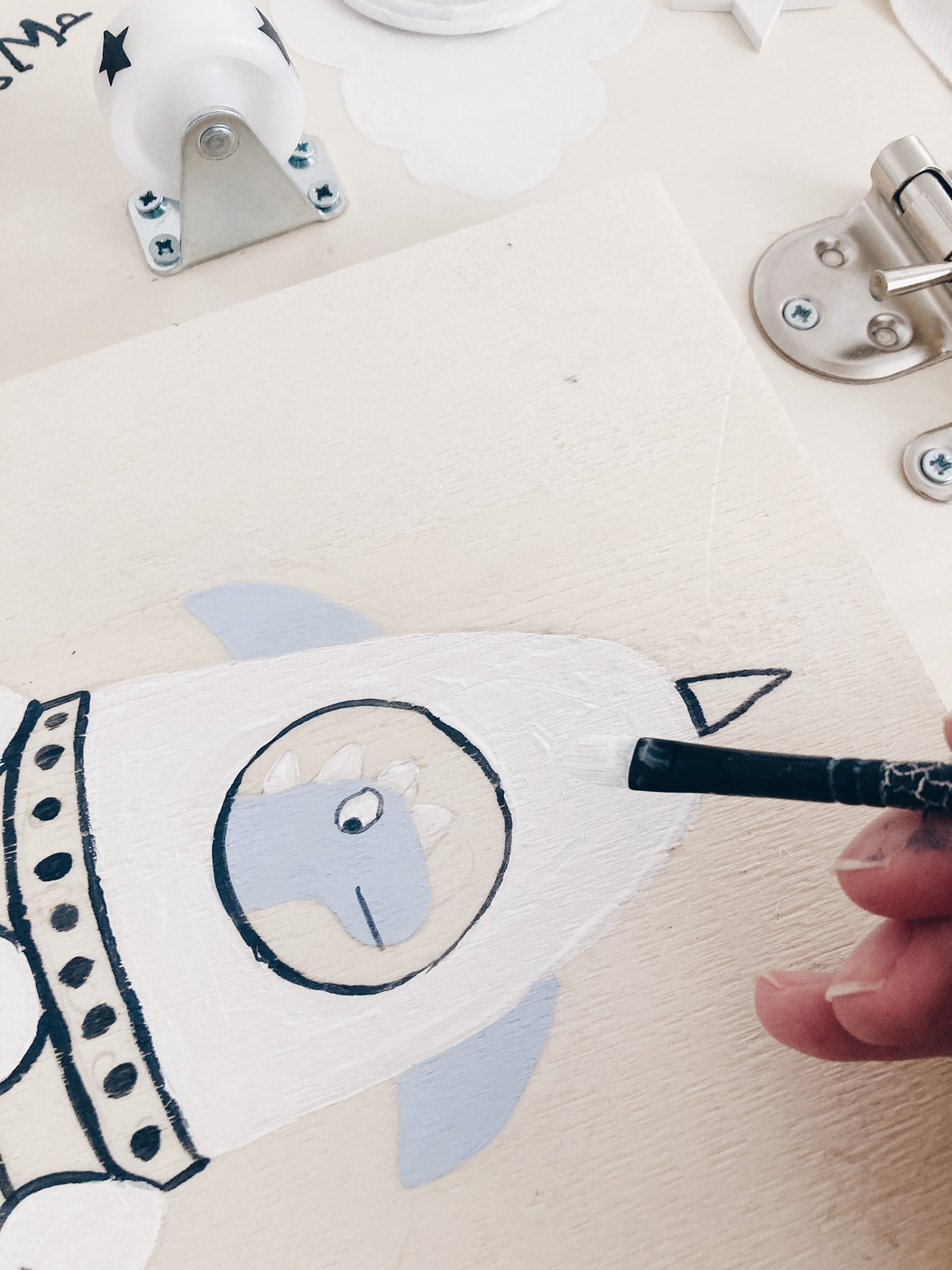 9. Pour la peinture , attention , si vous n’êtes pas à l’aise, contentez vous de formes simples , comme des pois ou rayures , lune etc , et pas plus de 3 couleurs différentes pour avoir une harmonie visuelle 😉
