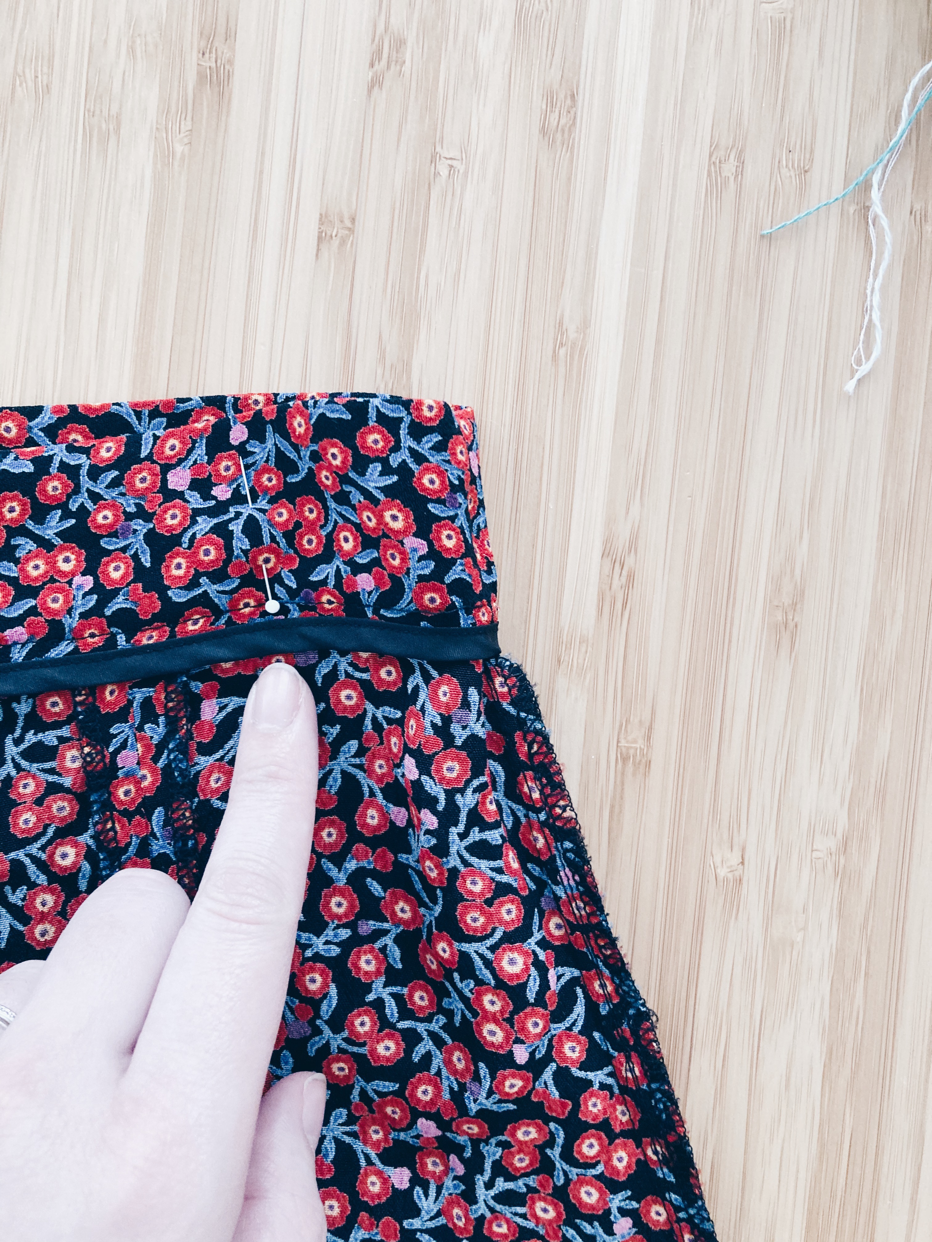 - Tout d’abord enfile ta jupe sur l’envers et ajuste la jupe à ta taille en épinglant le surplus de tissu