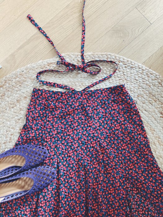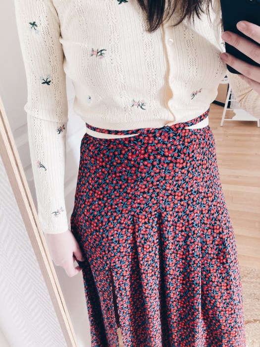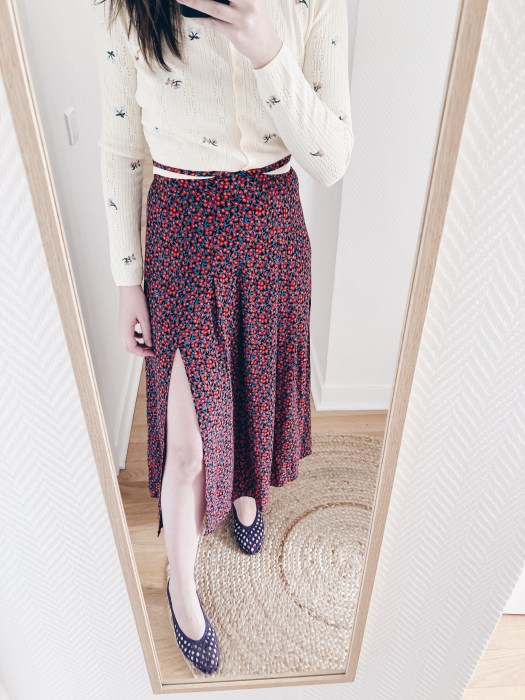 Cela fait quelques mois que je pensais à cette jupe zara à fleurs que j’aime beaucoup, et que j’ai acheté durant ma grossesse. Aujourd’hui j’ai bcp moins de ventre et très envie de la porter de nouveau, mais comme je l’avais acheté 2 tailles au dessus de la mienne il fallait faire une petite transformation