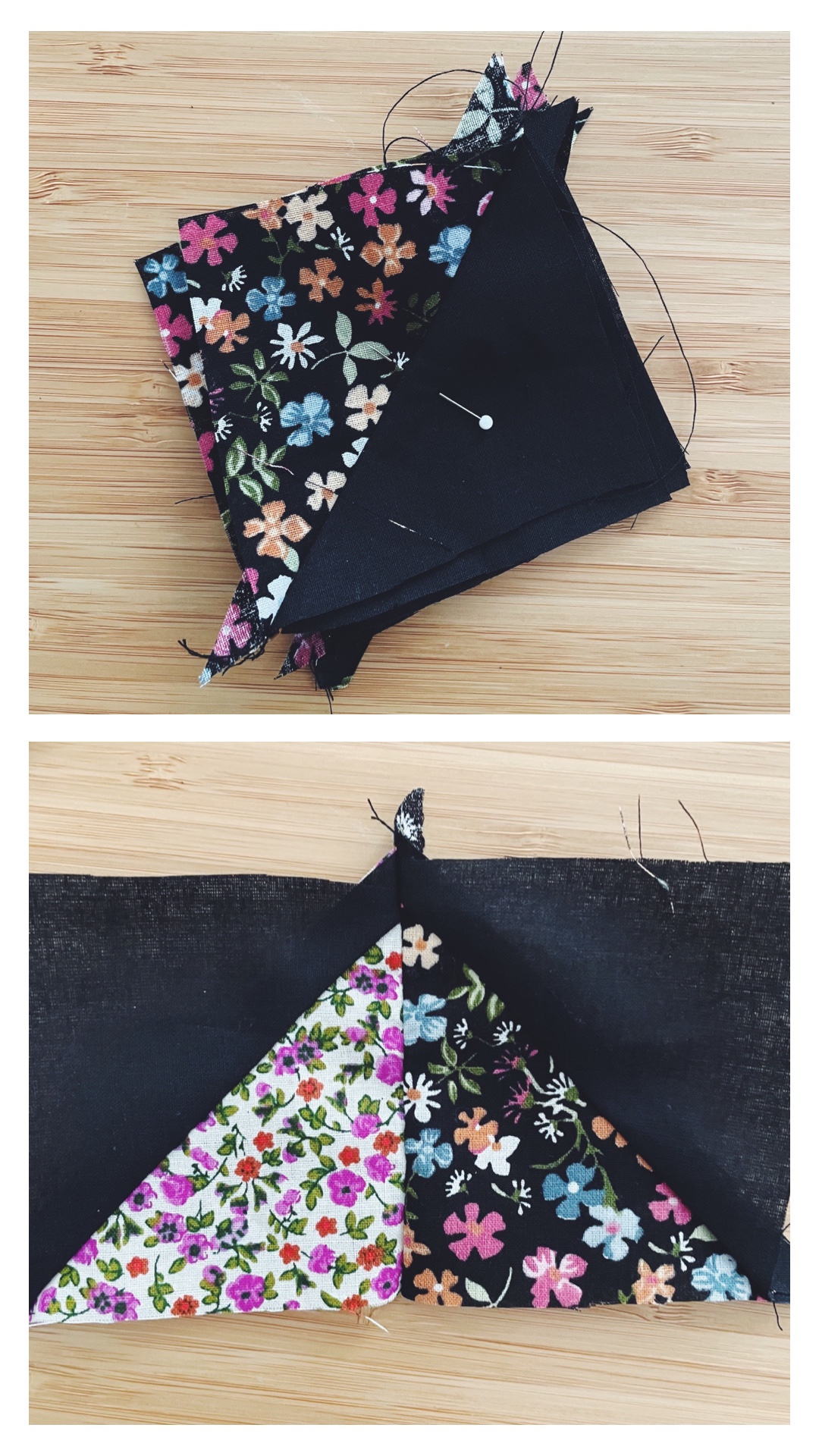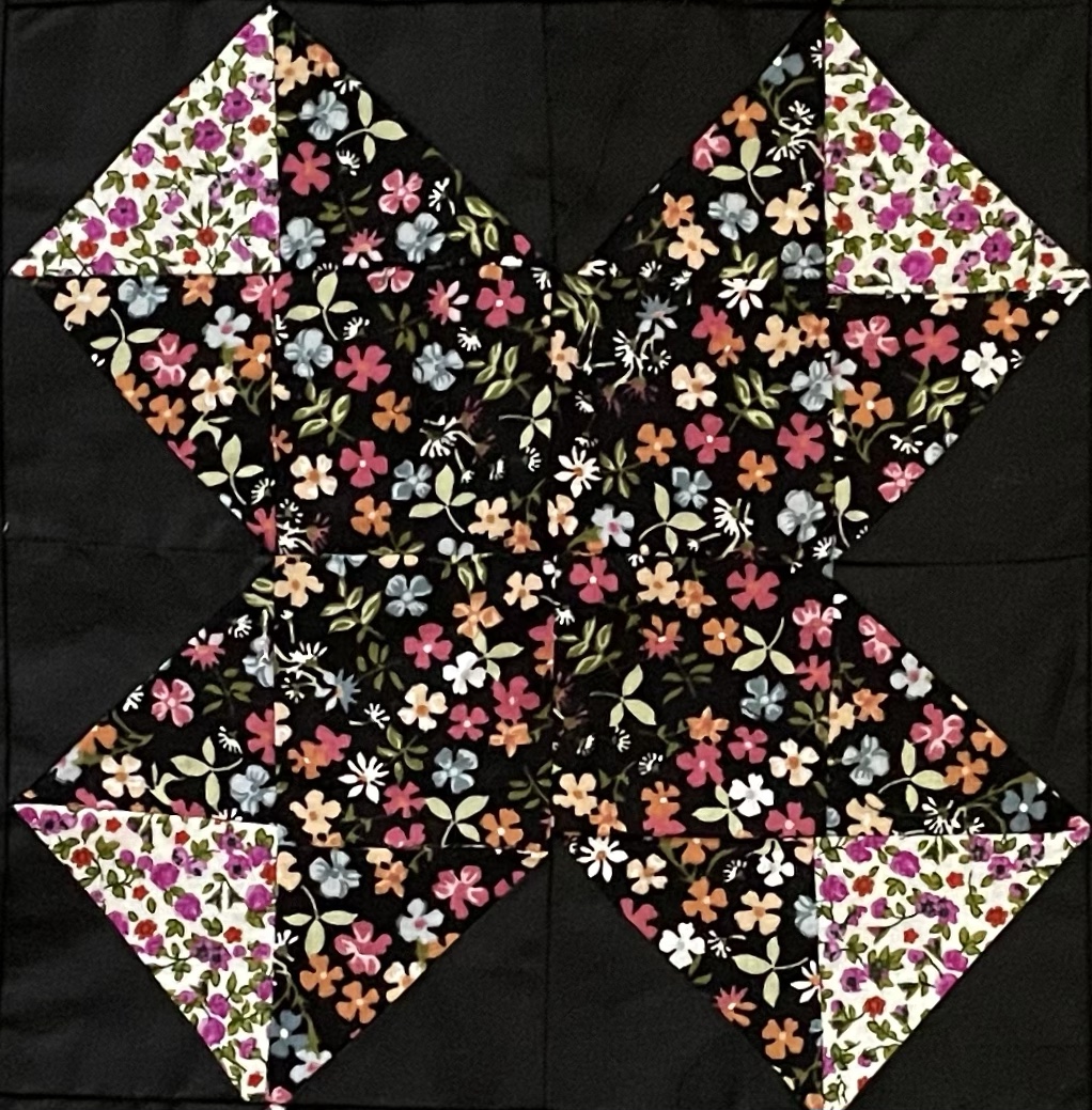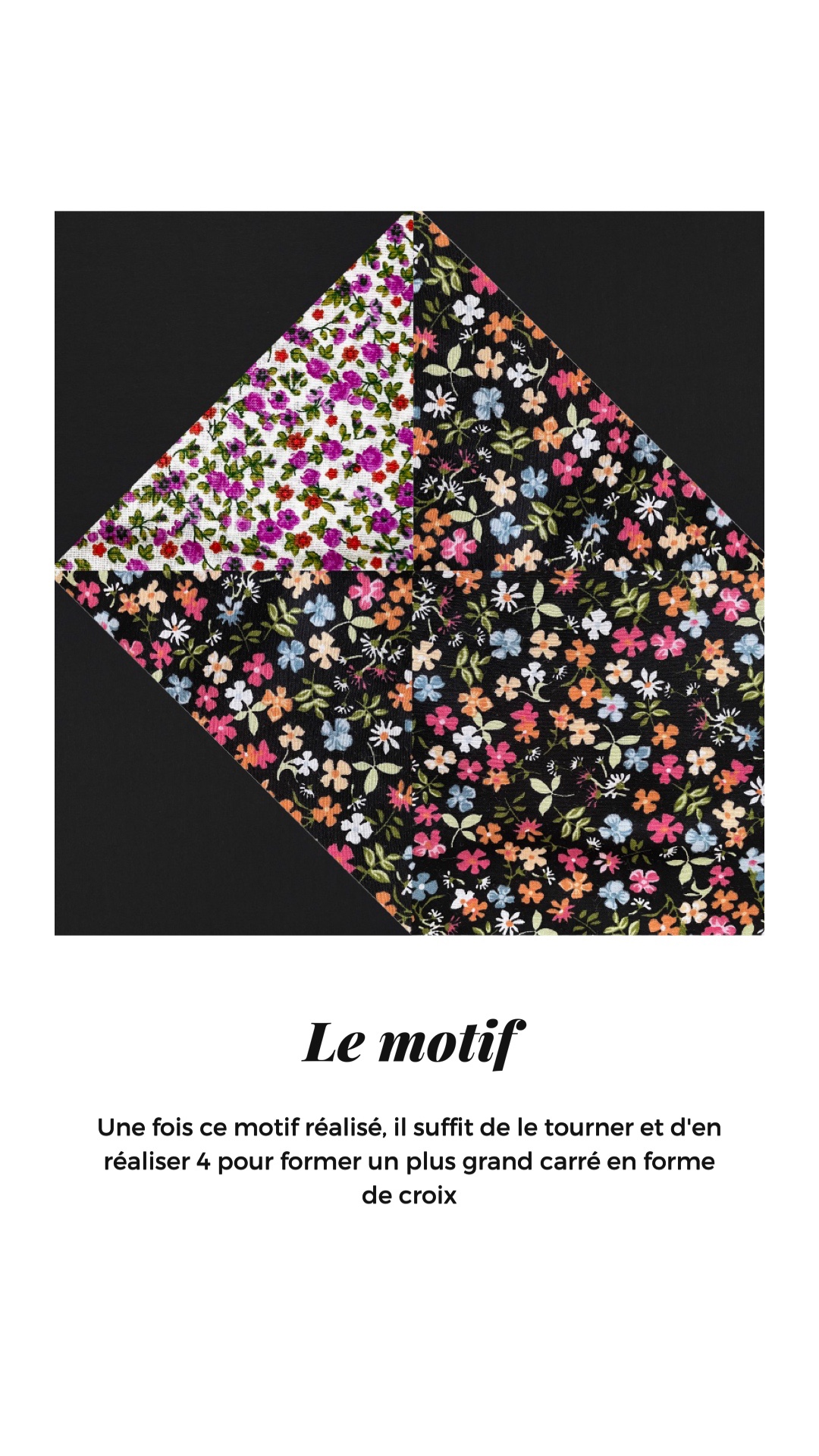 - Réaliser les motifs patchwork : en coupant selon le modèle dans le patron les couleurs dont vous avez besoin ( vous pouvez en couper une bonne quantité ) puis les construire par carré puis avec 4 carré vous avez votre motif en croix