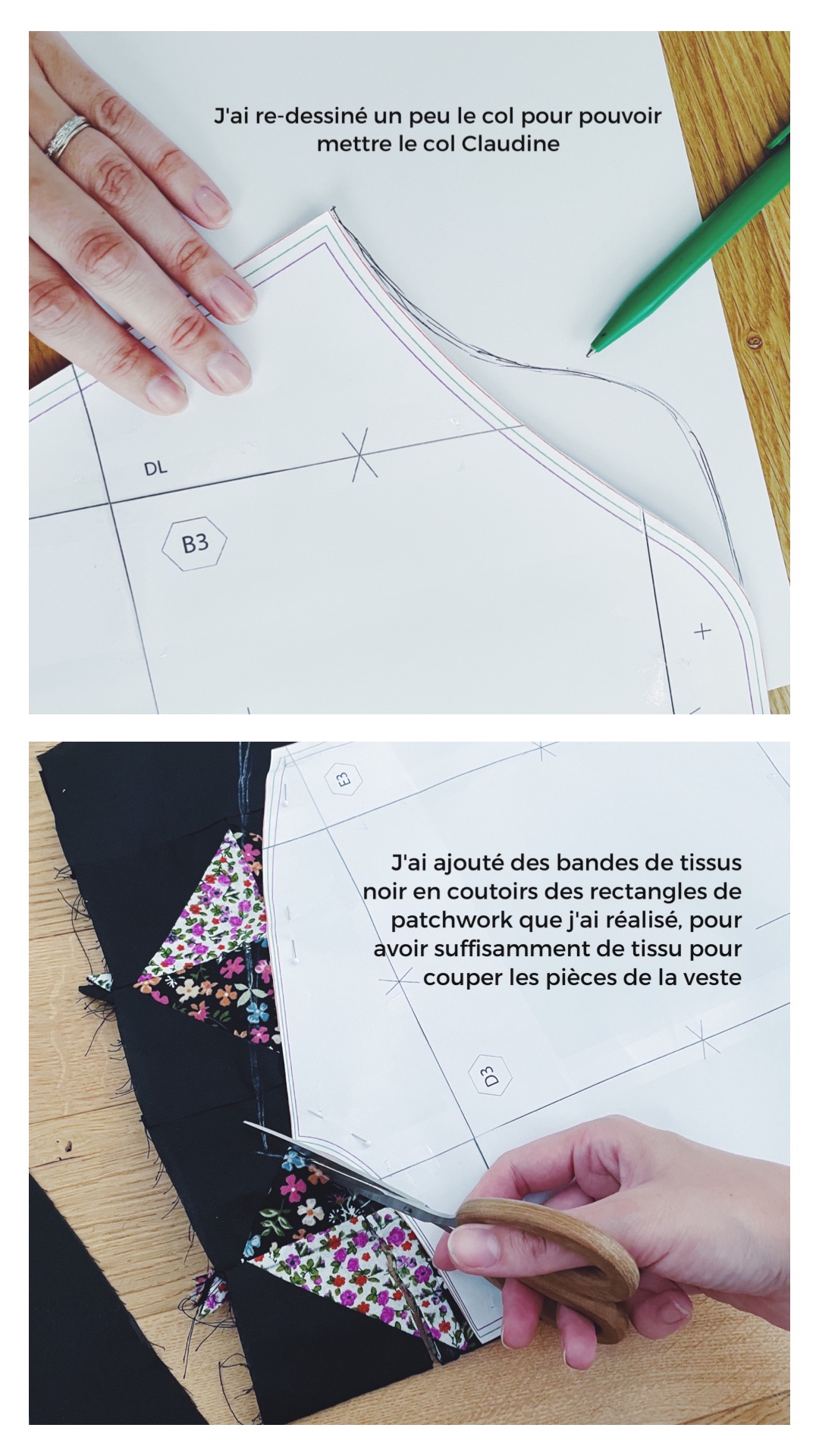- Redessiner le col : pour pouvoir insérer le col Claudine du patron magnésium, j’ai positionné le patron du col sur le patron du devant de veste et j’ai dessiner une courbe similaire à celle du col pour qu’il s’insère bien