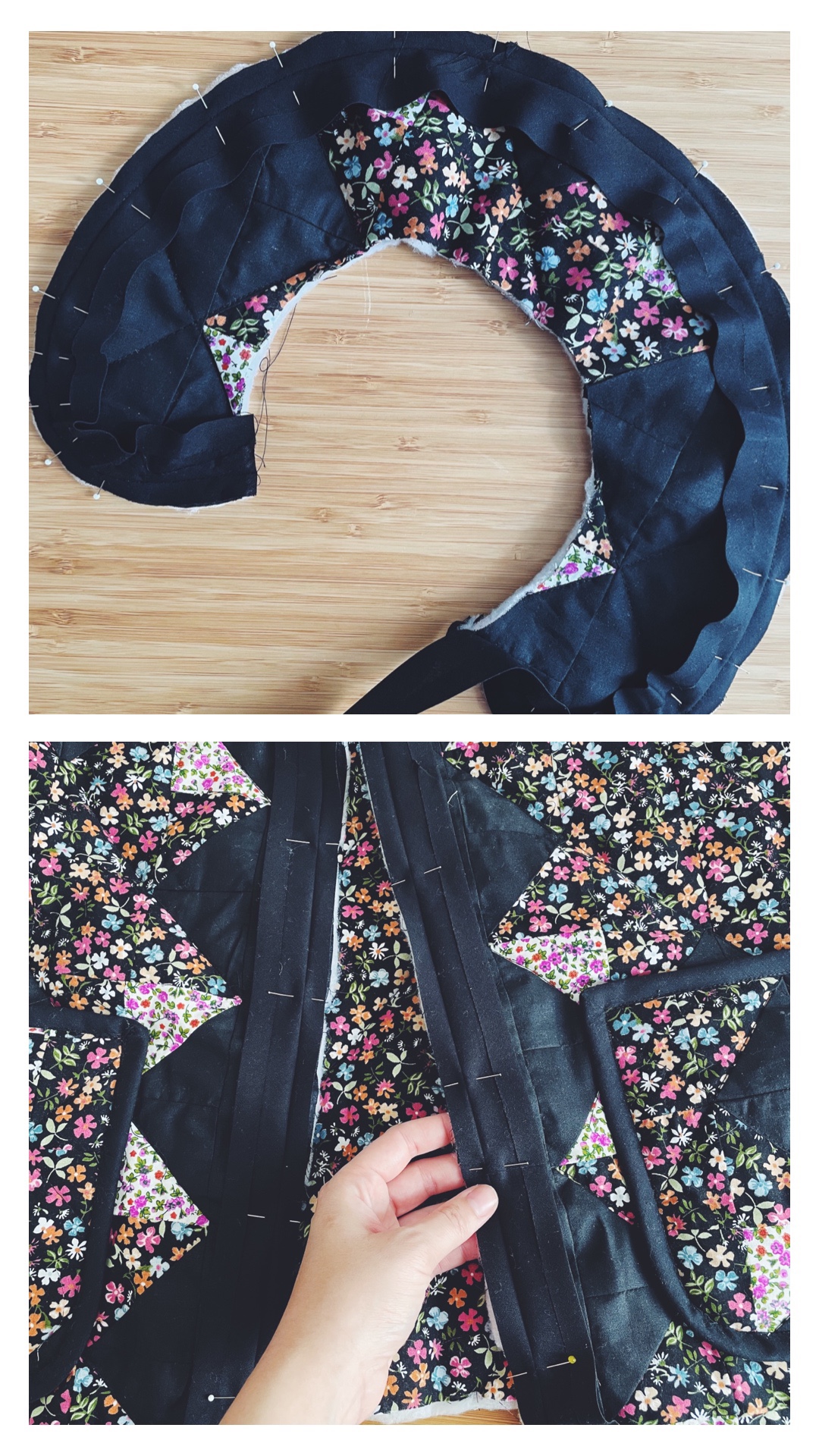 - Puis assemblez les pièces devant et dos au niveau de l’épaule , ensuite il faut positionner le col et venir poser le biais le long des bords de devant et du cou ( le col doit être positionné sur l’intérieur pour la couture et doit être retourné vers l’extérieur une fois fini
