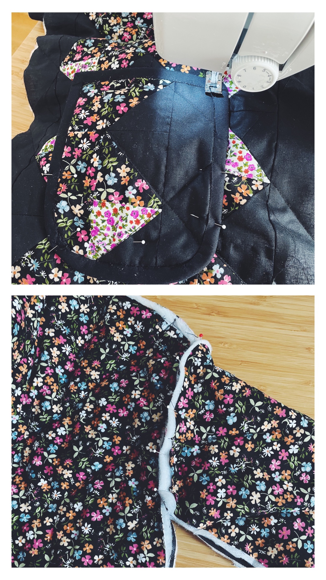 - Réaliser le matelasssage : moi j’ai simplement fait des coutures en diagonales le long des lignes de mon motif ( je n’avais pas envie de faire un motif complexe ) Attention de bien épingler les 2 parties en tissu bien en face l’une de l’autre pour ne pas avoir de décalage