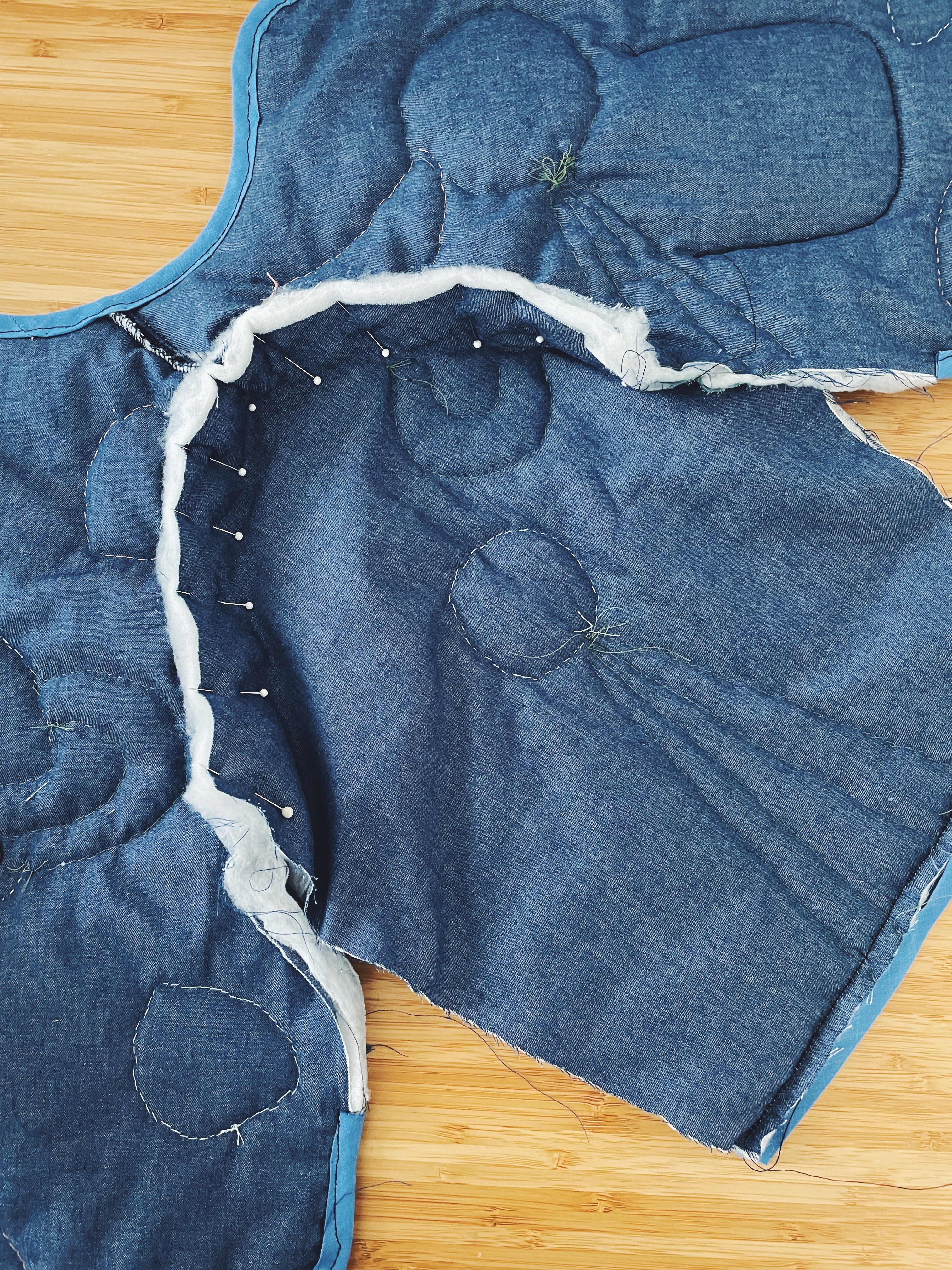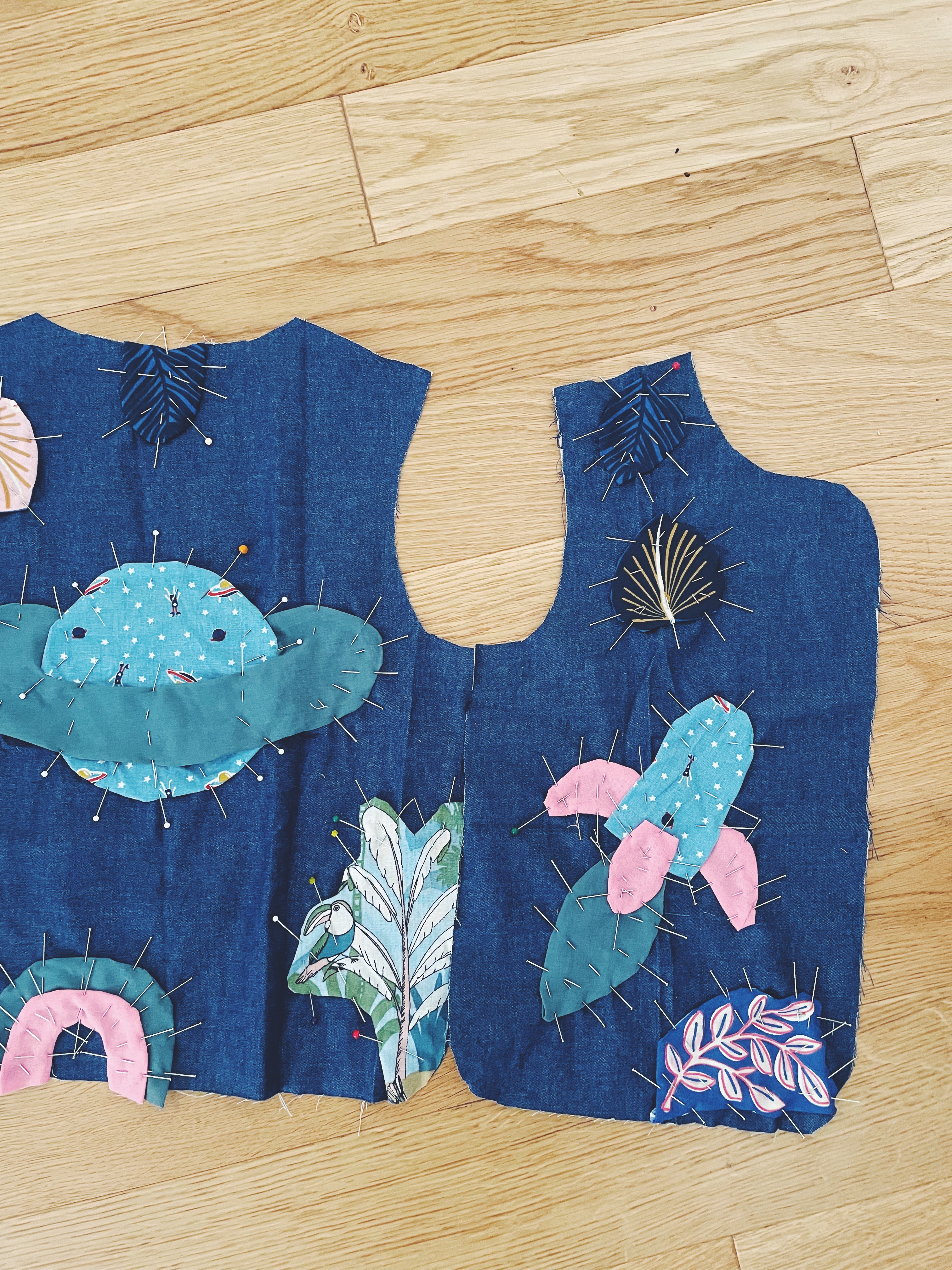 - Ensuite il faut assembler les pièces du dos et des devants et commencer à épingler le biais