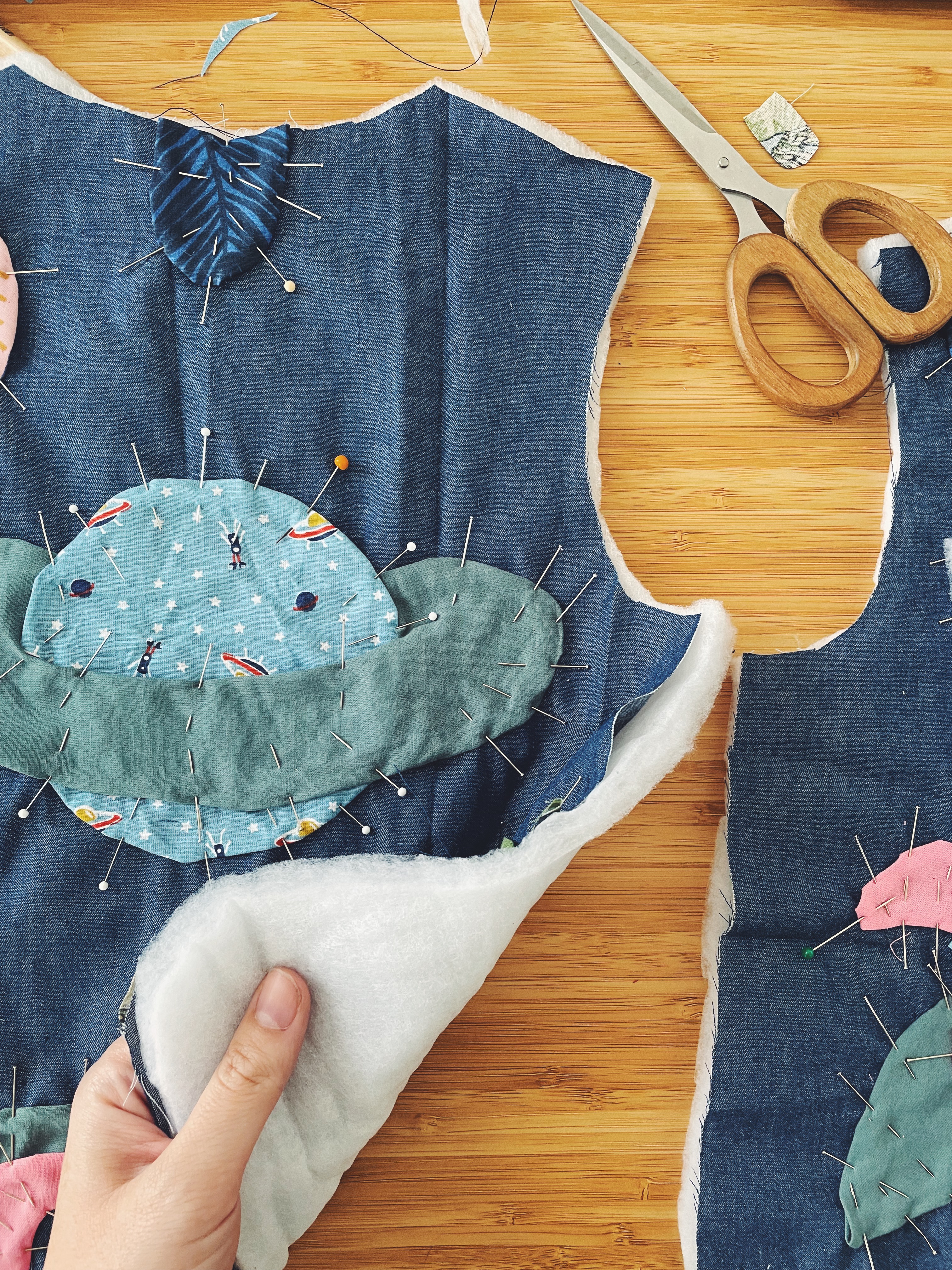- Puis créer son illustration en découpant et superposant des petits bouts de tissu que l’on épingle soigneusement pour obtenir les bonnes formes