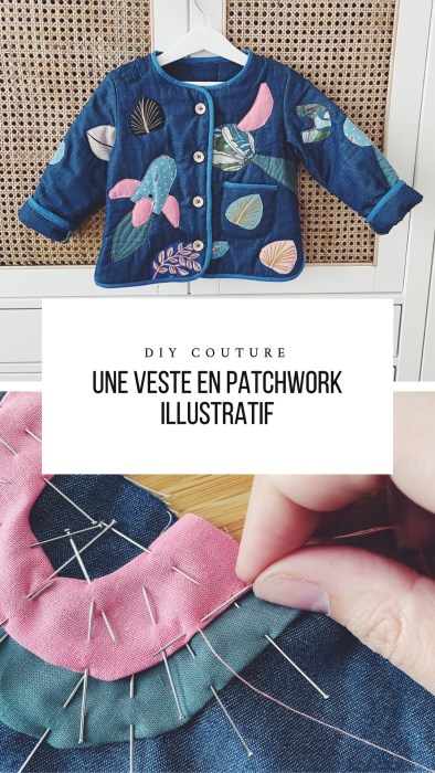 Hello girls ! Et oui, je ne m’arrête plus ! Je commence à prendre goût au patchwork, cette technique offre tellement de possibilité à mes chutes de tissu ! Voici donc un nouveau tuto, je vous montre comment j’ai créé cette veste à motif patchwork illustratif, car oui on peu dessiner pleins de choses avec du tissu !