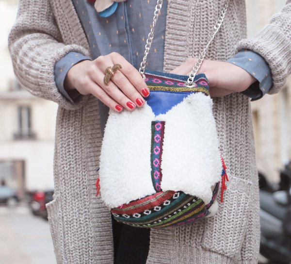 Ce petit sac est réalisé avec un genre de tissus effet peau de mouton, des franges en cuir et un tissu imprimé, une petite chaine pour anse et voilà le tour est joué ! 🙂