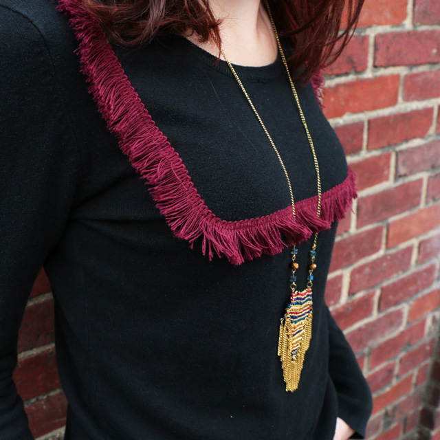 • calcule la distance des épaules de ton pullover, et choisis le milieu pour faire démarrer ta bande de franges. ensuite dessine un carré jusqu’à l’autre épaule de ton pullover.